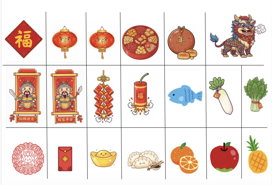 首先,與孩子討論新年的時候會看到什麼物品,哪些是裝飾類的,而哪些是食物可以吃。