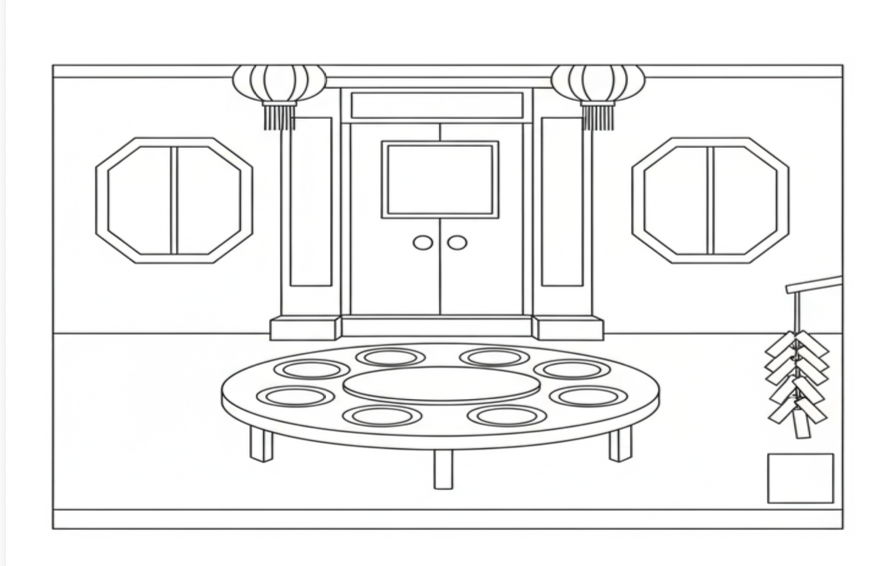 接著,可以與孩子一起剪貼相關的裝飾品和食物圖卡,將圖卡裝飾在場景圖中合適的地方。過程中,能練習指令的理解(由家長或老師指示要如何裝飾)、也可以讓孩子自由發揮後進行討論練習表達的目標。可以引導相關的動詞,例如:「吊」燈籠、「貼」春聯、「掛」炮竹串等。也可以練習方位詞的理解與表達等。或者直接請孩子描述家中佈置的狀況。